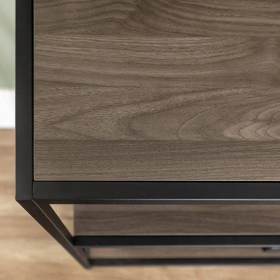Showcase your books, magazines, media and more with the Frame Metal and Wood Media Bookshelf from Saracina Home. The combination of faux wood and metal creates texture and personality that will still complement any style of decor. Consider this three-shelf console table with storage to organize cluttered living and family areas.